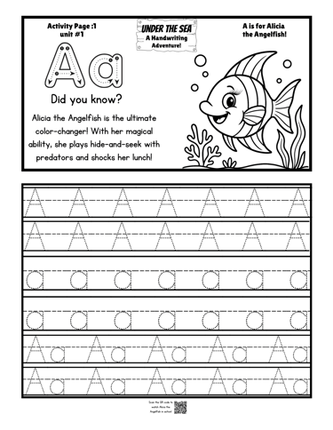 Each letter gets a super cute sea friend! Kids can trace 'A' with Alicia the Angelfish, color all the sea critter pages from A to Z, and then scan the QR code to watch them all in action.